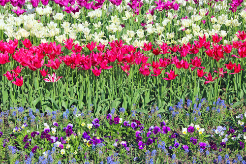 Naklejka premium lilac red and white tulips on flower bed in city. Springtime garden