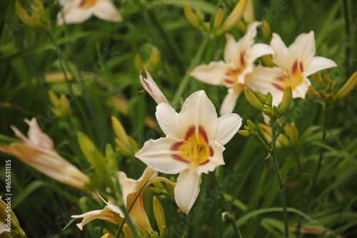 Fototapeta premium Lilia biała kwitnąca na tle liści zielonych