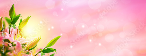© tainar, Fototapeta premium Lily flower blooming bouquet panorama. Greeting card background. Toned image. Template background