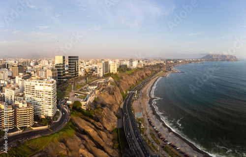 © jakartatravel, Fototapeta premium Lima, Peru: Aerial drone panorama of the famous Miraflores district above the Coasta Verde coast and highway and the Pacific ocean in Lima, Peru capital.