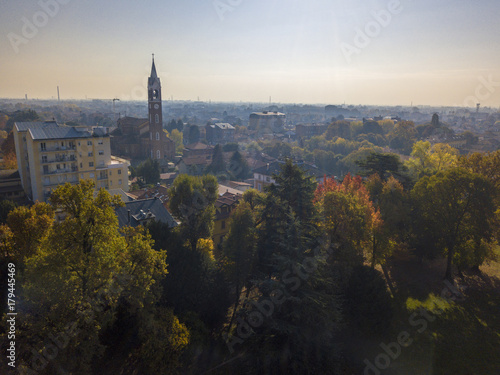 © Naeblys, Naklejka premium Limbiate, vista aerea, parrocchia di San Giorgio, chiesa, abitazioni strade e vie del centro. Italia