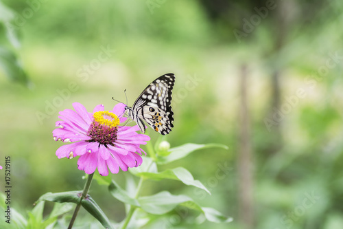© supanee2550, Naklejka premium Lime Butterfly sucking nectar from zinnia flowers .