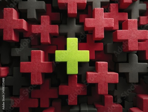 © Kanisorn, Obraz premium Lime green plus symbol standing out among red and black crosses