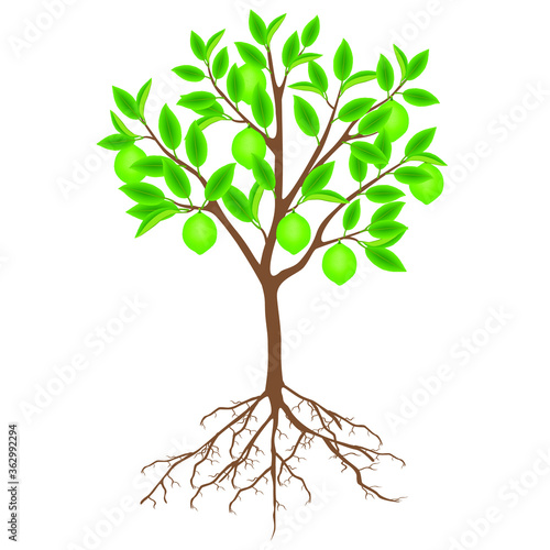 © zxczxc80, Fototapeta premium Lime tree with fruits and roots on a white background.