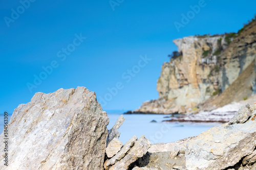 Fototapeta premium Limestone cliff next to ocean with boulders in foreground