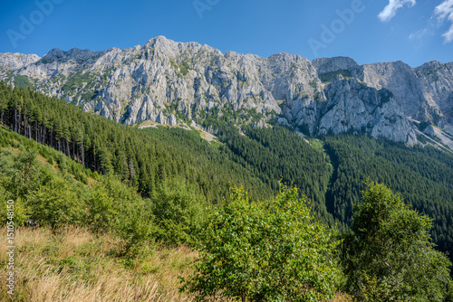 © Emad Aljumah, Fototapeta premium Limestone Cliffs and Forested Hills of Piatra Craiului Seen from a Mountain Clearing, Brașov County