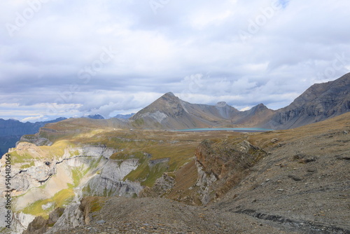 Fototapeta premium Limmerensee reservoir surrounded by Muttenchopf mountain and Muttsee mountain lake in Glarus, Switzerland