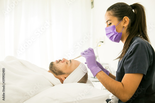 © JP STUDIO, Obraz premium Limpieza facial de un hombre calvo en un spa, con fondo blanco y guantes morados y mujer dermatologa con cubre bocas