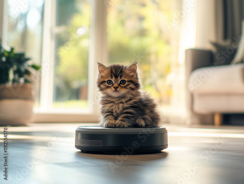 © JuananSH, Obraz premium Lindo gato juega sobre una aspiradora en el salón de una casa