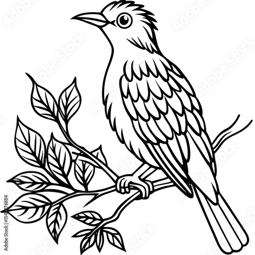 Fototapeta premium Line art bird perched on branch with leaves