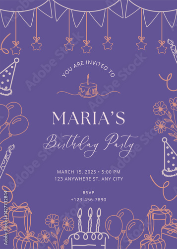 © blossom17, Fototapeta premium Line art Birthday party invitation template vector illustration. Birthday girl invitation card design.