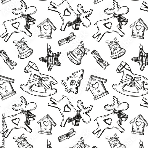 Fototapeta premium Line art Christmas and New Year pattern with toys. Wrapped Christmas paper