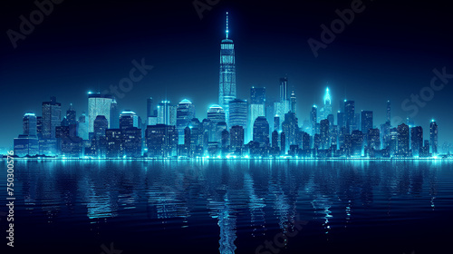 Obraz premium Line art - cityscape - skyline - neon lights - bright lights - water - coastal - bay - inlet - harbor - office buildings - skyscrapers - architecture