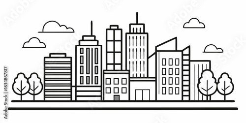 Obraz premium Line art cityscape with office buildings and trees, minimal black outline style, isolated on white background, clean vector illustration