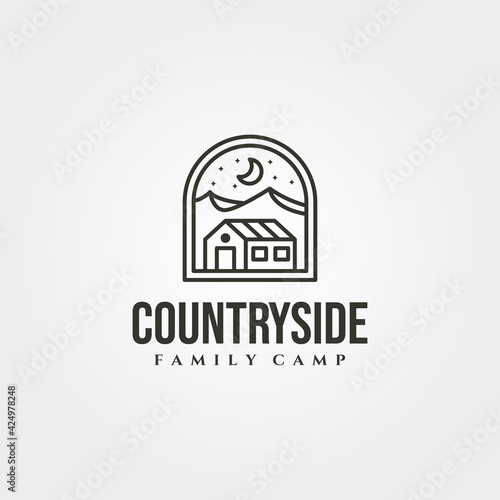Fototapeta premium line art cottage house vector symbol illustration with mountain view logo design