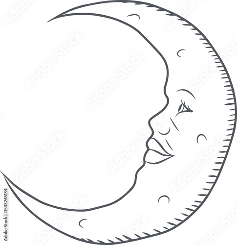 © vectorfusionart, Naklejka premium Line art crescent moon is curling with face, hatch marks, crater dots on transparent background