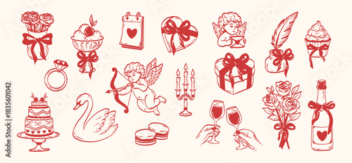 © Olgadesigner, Fototapeta premium Line art elements for Valentine's day, wedding invitation, birthday card.Cute girly bows,hearts, ribbons, champagne, desserts, angel. Vintage elegant vector illustration.