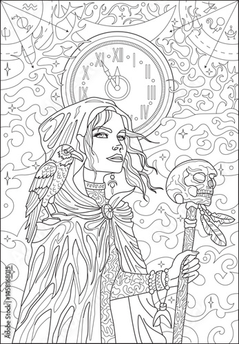 © samiramay, Obraz premium Line art Halloween illustration with beautiful witch girl wearing gothic cape holding wand with scary skull against background of old clock, mystic symbols and mist. Coloring page for adults