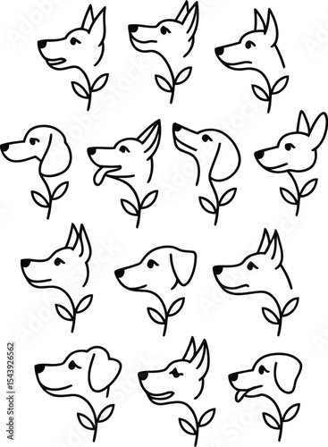 © Adnan, Naklejka premium Line art illustration of dog heads with floral stems on a white background