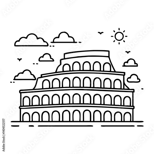 Fototapeta premium Line Art Illustration of the Colosseum Under a Sunny Sky with Clouds and Birds