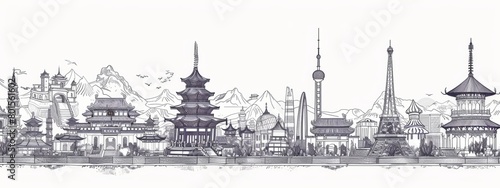 Fototapeta premium Line art illustrations of traditional architecture and landmarks from...