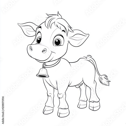 © lestari, Fototapeta premium Line art of a calf standing with a bell, on white background for coloring