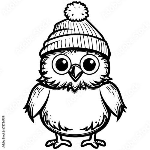 Fototapeta premium line art of a cute Christmas bird with hat , Svg file, black and white, outline art, coloring book.