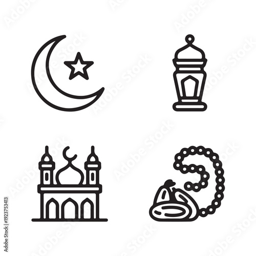 Obraz premium Line Art Ramadan Icons Crescent Star Mosque Prayer Beads Dates islam moon