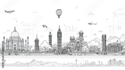 Fototapeta premium Line art showcases global landmarks, hills, plane, balloon, and helicopter on white