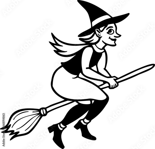 © hinh, Fototapeta premium Line Art Witch flying on broomstick with pointed hat and boots in line art style