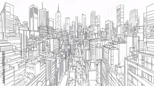 Fototapeta premium Line drawing of a bustling cityscape with towering skyscrapers and busy streets, representing urban development and modern architecture.