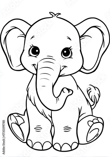 © ariya, Fototapeta premium Line drawing of a cute baby elephant sitting isolated on a white background