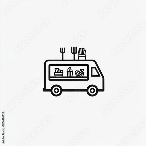 © aritha, Fototapeta premium Line drawing of a food truck with forks, fries, and ice cream on top.