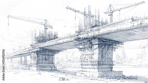 Fototapeta premium Line drawing of a massive bridge under construction, cranes and workers visible, symbolizing civil engineering and infrastructure development.