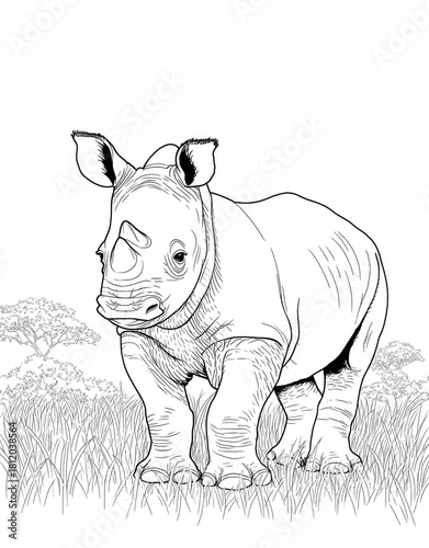 © Tembak, Fototapeta premium Line drawing of a rhinoceros calf standing in tall grass outdoors