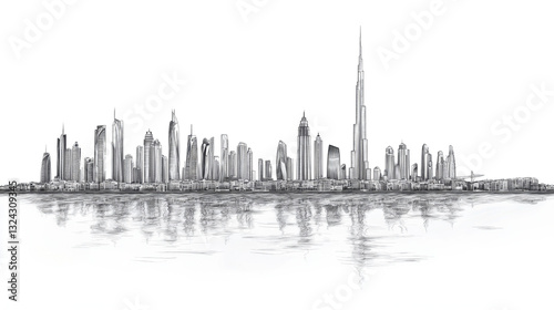 © Ai, Naklejka premium Line drawing of Dubai city skyline United Ara isolated on white background a