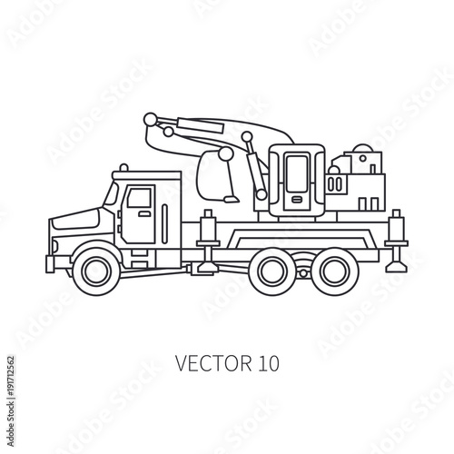 Fototapeta premium Line flat vector icon construction machinery truck excavator. Industrial style. Corporate cargo delivery. Commercial transportation. Building. Business. Engineering. Diesel. Illustration for design.