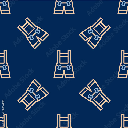 © Iryna, Obraz premium Line Lederhosen icon isolated seamless pattern on blue background. Traditional bavarian clothing. Oktoberfest outfit. Pants with suspenders. Patrick day. Vector