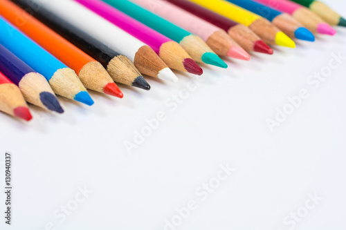© billlivingstone, Naklejka premium Line of Colored Pencil Crayons Close Up Isolated on White