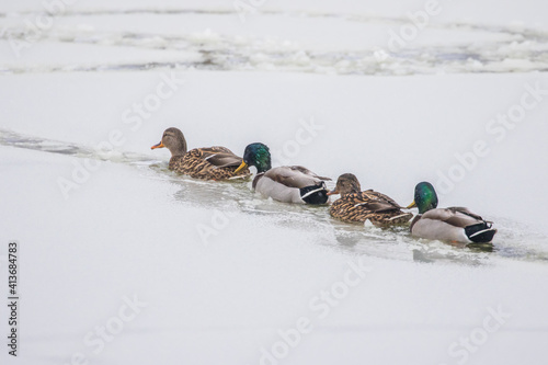Fototapeta premium Line of Mallard Ducks Paddle Through Icy Water in a Winter Snow Storm