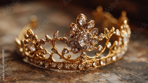 © Jiraporn, Obraz premium Line tiara in retro vintage concept. Elegant golden tiara adorned with dazzling gemstones and details.