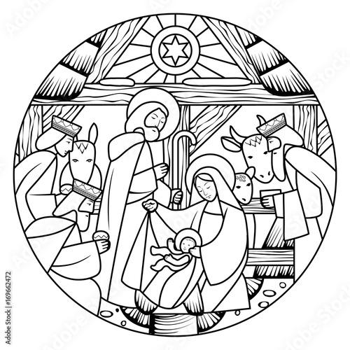 Fototapeta premium Linear drawing of Birth of Jesus Christ scene in circle shape