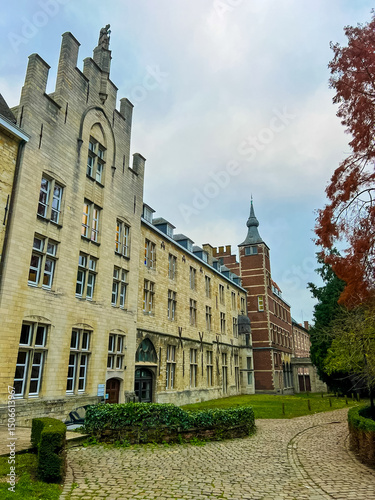 © pijav4uk, Obraz premium Linear facade of modern buildings in Leuven with tower and green surroundings