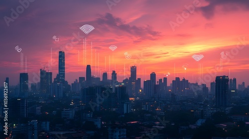 © Farid, Fototapeta premium Lines and dots as wireless connection technology icons in the sky over city at sunset.