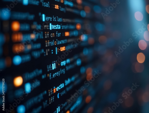 © dibas99, Obraz premium Lines of code illuminate a digital landscape in a high-tech environment during nighttime programming