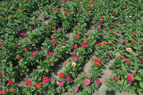 Fototapeta premium Lines of red, pink, orange, beige and magenta colored flowers of zinnia