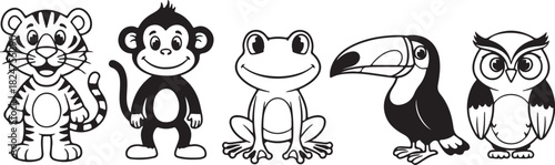 Fototapeta premium Lineup of Five Cartoon Animals Including Tiger, Monkey, Frog, Toucan, and Owl...