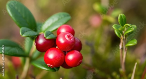 © Alexandr, Obraz premium Lingonberry cluster on glossy green leaves in shallow forest background