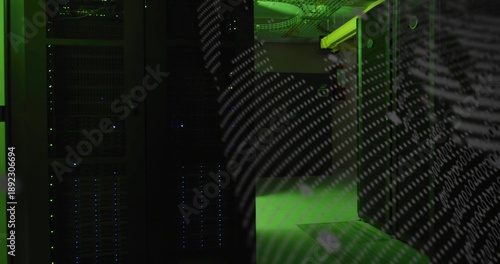 © vectorfusionart, Naklejka premium Lining server racks glowing status LEDs in server room showing fingerprint bits overlay, copy space