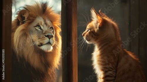 © donchanu, Fototapeta premium Lion and Cat Looking Through Window